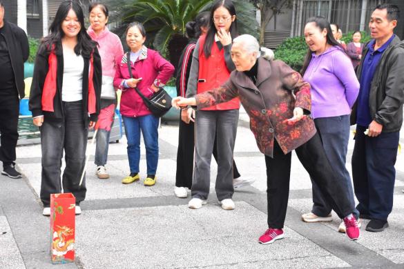 节目间隙,互动趣味游戏接连登场。投壶时,老人们眼神专注瞄准壶口,投中时像孩子般开怀大笑;猜成语时,大家围坐一起热烈讨论,不时分享自己的思路;玩 “愤怒的小鸟” 时,更是手眼协调,笑声回荡在广场上空。游戏结束后,志愿者们贴心地为老人们分发礼品,每份礼物虽轻,却装满了对老人的关爱,现场其乐融融。