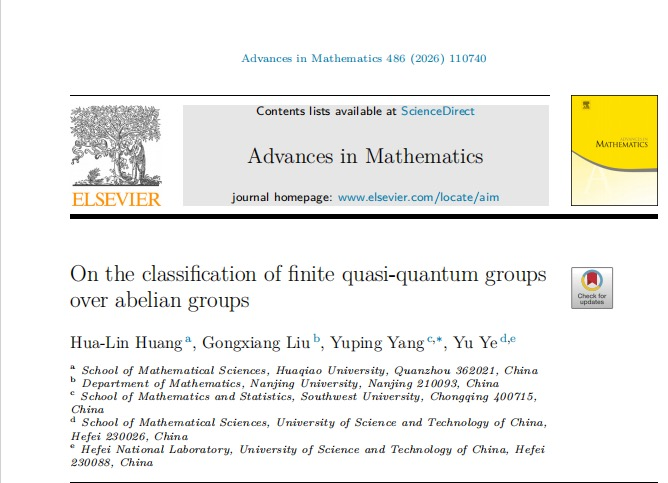 近日,学院杨毓萍副教授与合作者在国际著名数学期刊《Advances in Mathematics》上发表题为《On the classification of finite quasi-quantum groups over abelian groups》的研究论文,西南大学数学与统计学院为通讯作者单位。《Advances in Mathematics》创刊于1961年,是数学领域公认的顶级期刊。该期刊致力于发表数学领域具有突破性的重要成果,享有很高的学术声誉。